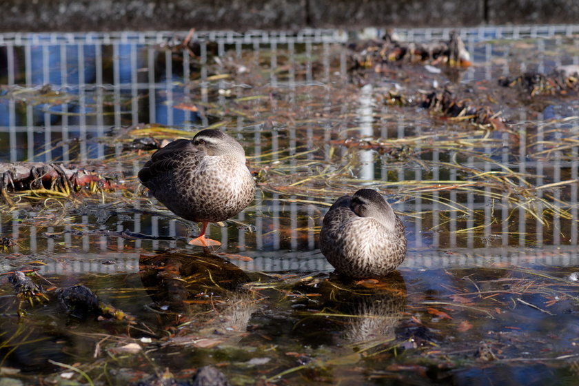 スイレン池に立ち寄ったら丸い石が置いてある? と思ったらカルガモさんでした。